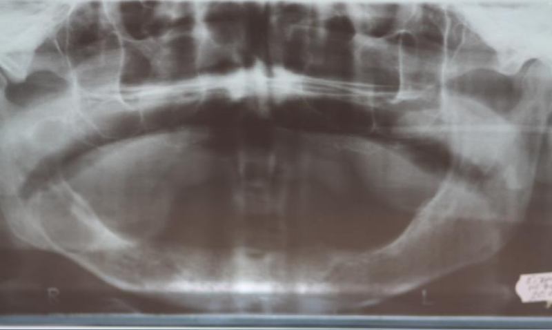 The patient was assigned for a surgical treatment at the department of head and neck surgery at the Center of Oncology of Latvia, where he was stationed at 23.11.2010, at the hospital there were no changes in local state of the patient. The patient recalls from his medical history, that he had heart rhythm disturbances that were treated with Cordarone pills, he noted that he sometimes had an increased blood pressure that he controlled with Betaloc pills. The patient is a chronic smoker- he smokes 10-15 cigarettes a day. The overall condition of the patient was good. Blood pressure 130/80 mmHg, pulse 65x min. The blood tests showed a decreased amount of neutrophil leucocytes 31.1%, an increase of lymphocytes 59.4%. The hemostasis indicators were without a deviation. An increased level of cholesterol 5.51 mmol/l. The patient was prepared for surgery in general anesthesia at 24.11.2010. On the morning of 24.11.2010 at 7AM the patient received premedication of Dormicum 7.5mg, Ranitidin 150mg and 30 minutes before surgery Promedol 2% 1ml, and Atropine 0.1%-0.5ml. The patient underwent a cystectomia mandibula dextra. At the beginning of surgery, the patient received 1g of Cefazoline i/v and Dexazone 12mg. A crestal incision was made on the right side of the lower third of ramus ascendens, retromolar and molar region. A mucoperiosteal flap and an opening in the resorbed bone was made to ensure a good field of vision of the surgical site. When access to the cyst was enlarged- 5ml of serous-purulent discharge was released from the wound. After the extirpation of the cystic lining, the bone cavity was rinsed with 0.2% chlorhexidine, a hemostatic sponge was inserted to control the bleeding. The wound was closed with 4-0 vicryl sutures without a drainage. The cystic lining was sent to histological examination. Postoperatively the patient received Cefazoline i/v injections- 1000mg 3 times a day, Diclofencaum natricum 75mg-3ml x2, and 0.2% chlorhexidine mouthwash. Histological results- after surgery NR152053/10- Cyst was lined with squamous epithelium that was infiltrated with chronic inflammation cells. Possibly a radicular cyst.
